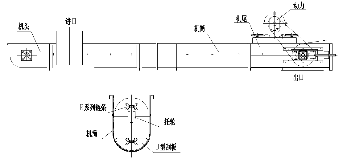 TGSU系列自清式(U)型刮板输送机主要由机头、机槽、刮板链和刮板、尼龙托辊、机尾、传动装置等零部件组成。