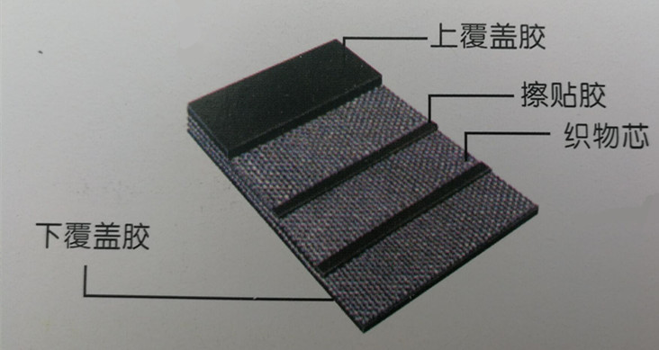 输送量大等。骨架材料选用合成纤维浸胶布,经向选用低收缩的聚酯,纬向为尼龙。并在提升带与头轮